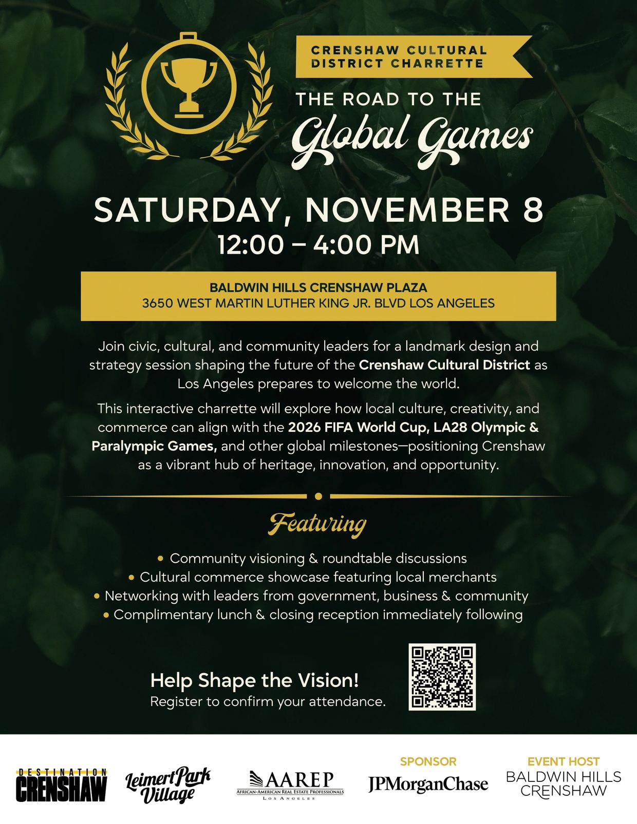 It's a Movement! It's a hub, a beacon for the African Diaspora and a thriving center for Black art, business and innovation. Your voice is essential in shaping its future and to better understand how we can enhance Leimert Park Village as a world-class cultural arts and eco-tourism destination!